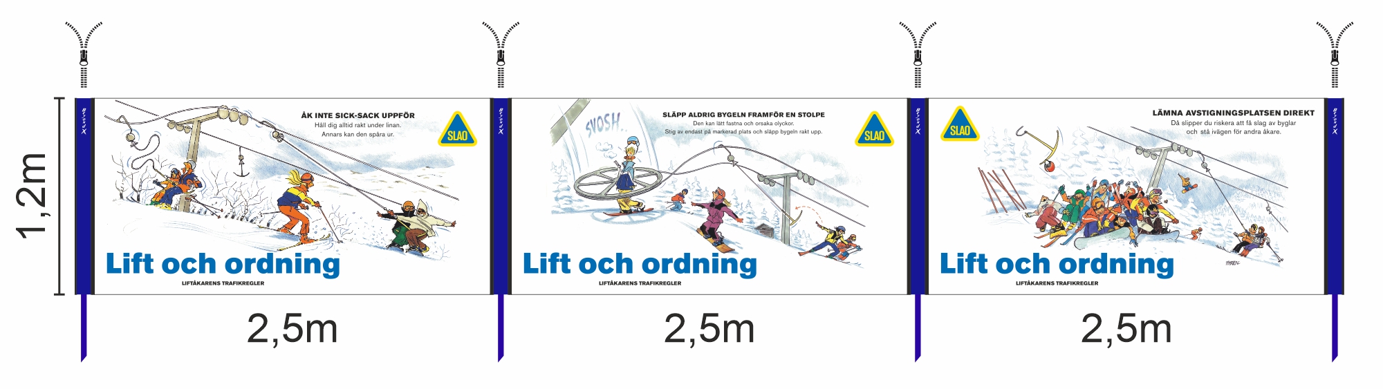 Släpp aldrig bygeln framför en stolpePraktisk nätbanderoll med blixtlås i vardera ända så den enkelt kan fästas i våra solpar för nät. Sätt sömlöst in denna i näten vid liften eller ensam längst liftspåret för att påminna gästerna där detta budskap gör skilland.
